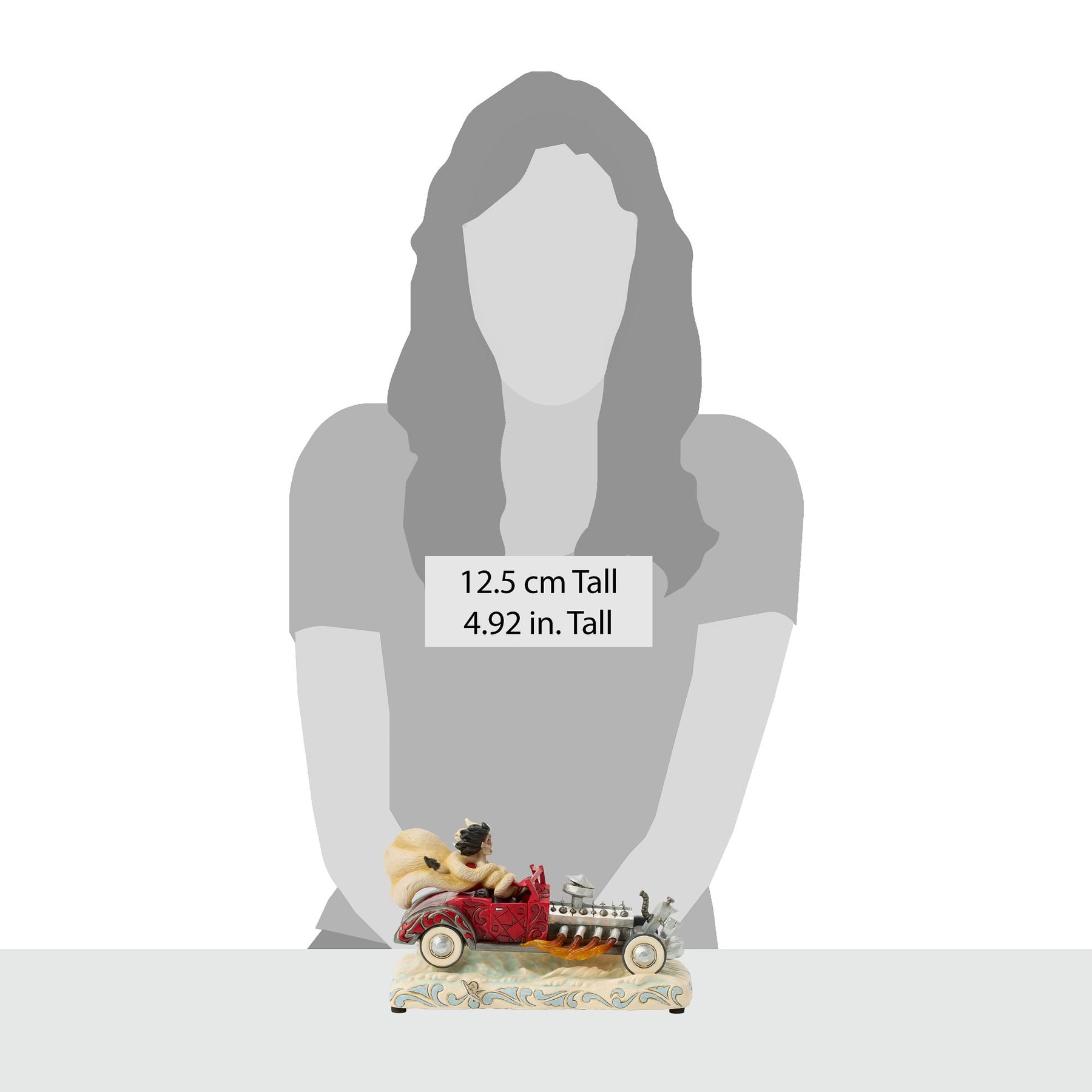 Celebrating the 65th anniversary of 101 Dalmatians, Jim Shore captures Cruella de Vil speeding in her red car adorned with rosemaling and patchwork. Flames burst from the engine as her wild hair and fur coat fly in tune to her signature melody.