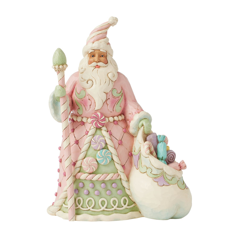 This adorable Heartwood Sweets Santa designed by Jim Shore is dressed in delightful pastel pinks and greens, adorned with whimsical sugar plum candies. Carrying a staff and a bag of sweets, his hat resembles twisted icing, while his cloak is patterned with an adorable quilted pattern, studden with rosy gumdrops.