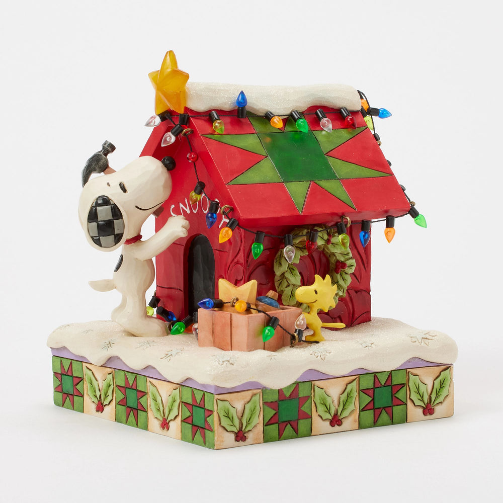 Celebrate the season with this Jim Shore Snoopy decorating his doghouse for Christmas. With a hammer in hand, Snoopy meticulously affixes festive lights, a star, and a wreath, to bring his holiday spirit to life.