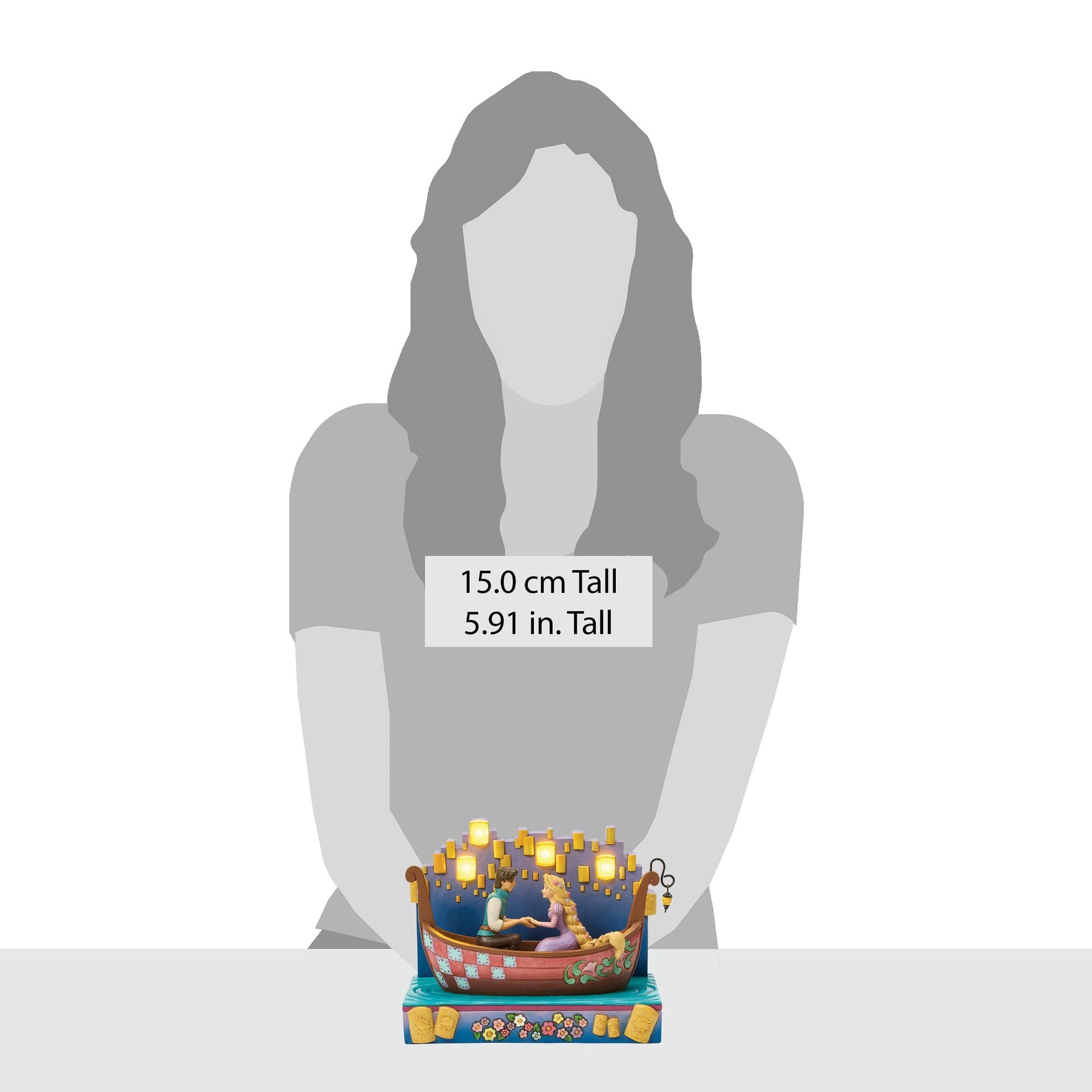 In this beautiful Jim Shore design, Rapunzel and Flynn Rider share a romantic boat ride through glowing LED floating lanterns. Capturing the enchantment, Rapunzel's charm shines with flowers in her hair. The boat features Jim Shore's iconic details. Perfect for celebrating 15 years of Tangled. Uses 3x AAA batteries, not included. Automatic timer for lights, 6 hours on, 18 hours off.